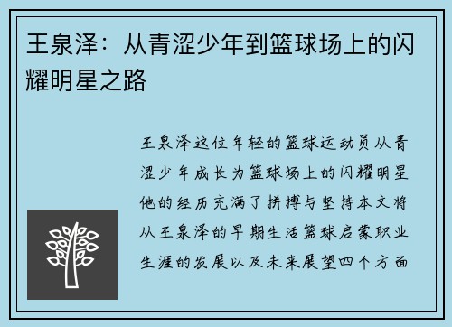 王泉泽:从青涩少年到篮球场上的闪耀明星之路